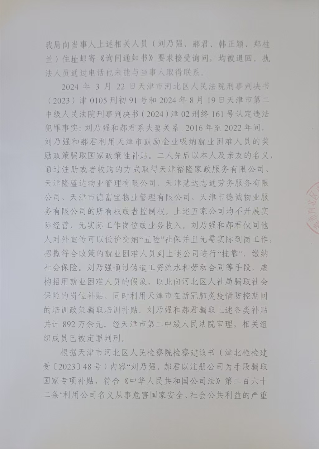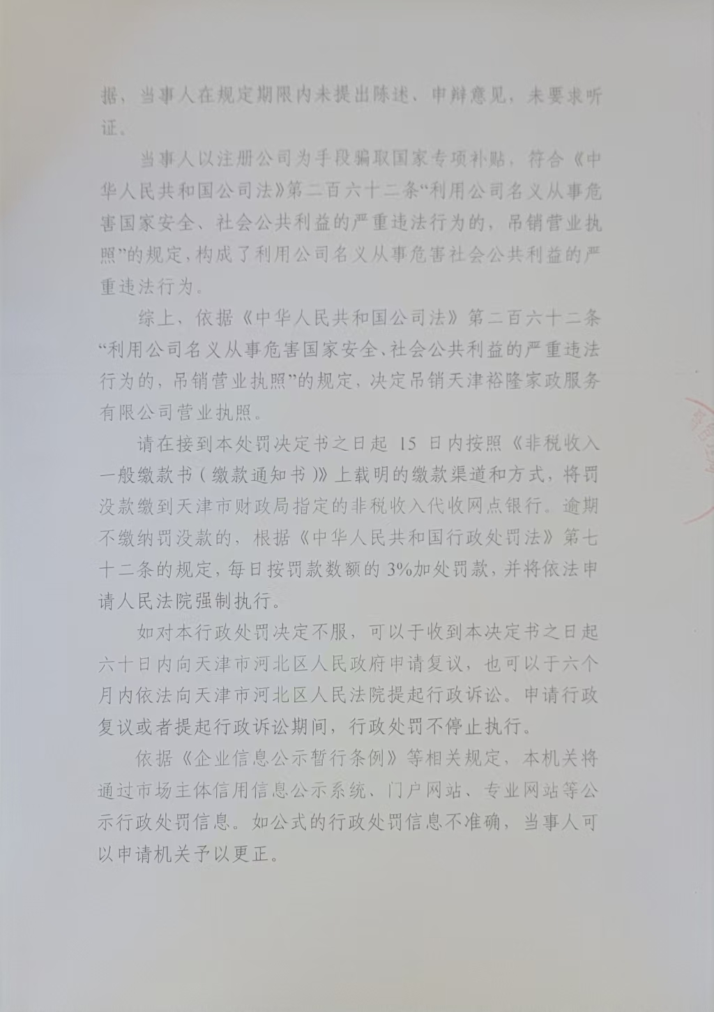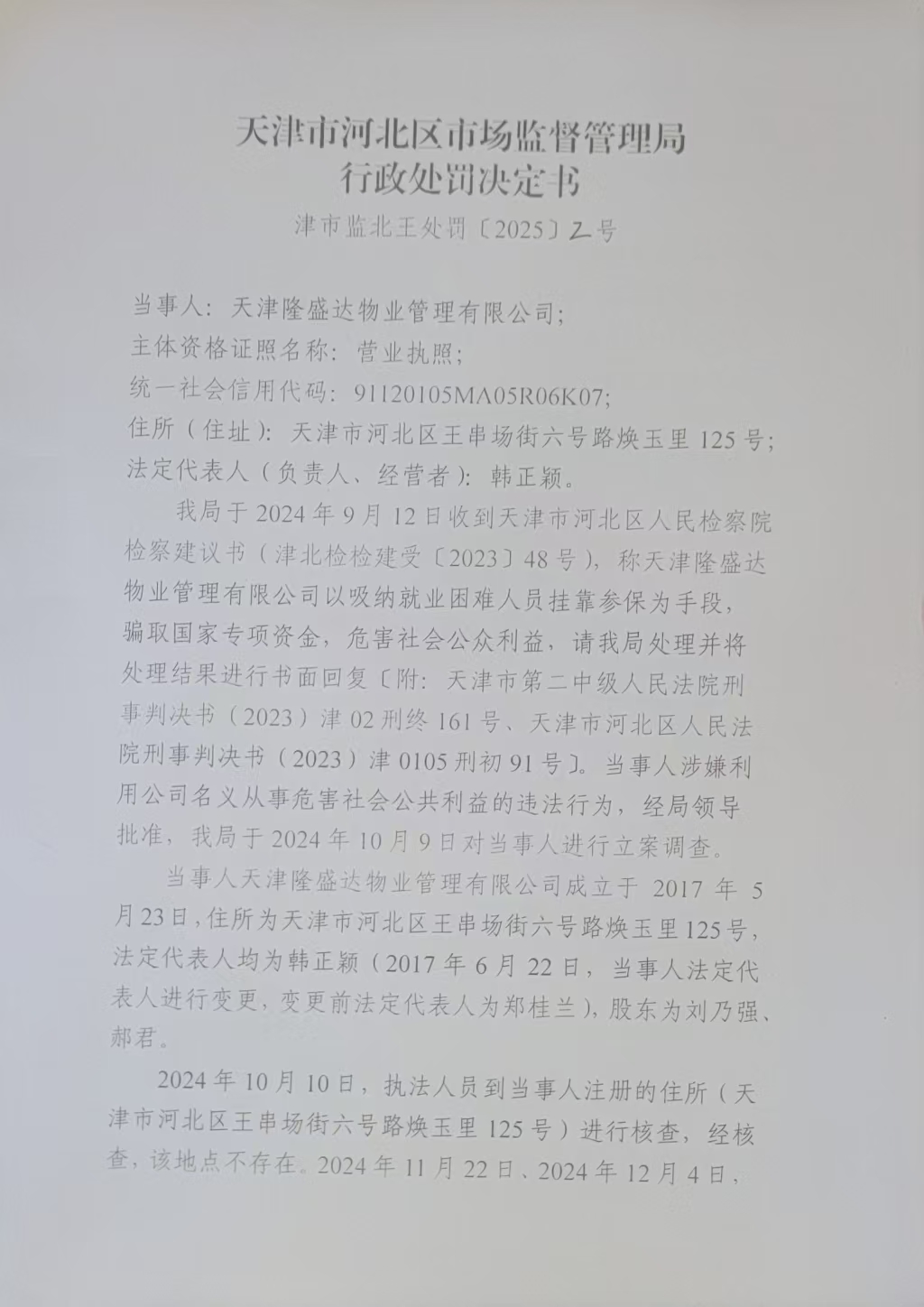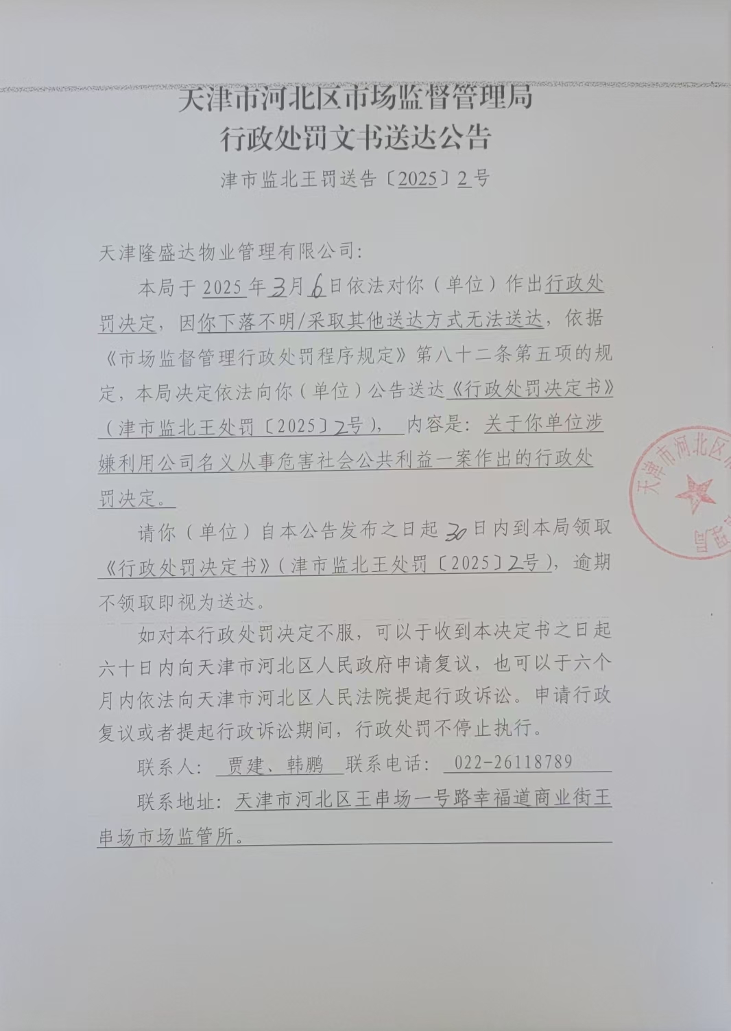 天津隆盛达物业管理有限公司利用公司名义从事危害社会公共利益案行政处罚决定书